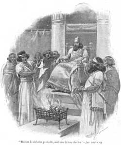 Long ago, a Jewish king (Jehoiakim) was handed a scroll with a message from God (written by Jeremiah). As the words were read aloud, the king was offended, and with a small knife he cut out a part of the scroll and threw it into the fire. Whenever he heard things that angered him, he cut it off and added it to the fire. Eventually the entire text was tossed into the flames. Jeremiah 36:24-25 says, “Yet neither the king nor any of his servants who heard all these words was afraid, nor did they tear their garments. Even when Elnathan and Delaiah and Gemariah urged the king not to burn the scroll, he would not listen to them.”